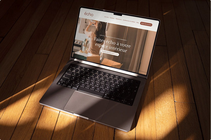 Écho se présente avec une identité à la fois moderne et douce. Son logo et ses couleurs épurées évoquent le calme d’un intérieur organisé. Des teintes plus joyeuses et des icônes aux lignes courbées viennent compléter l’ensemble, apportant une touche chaleureuse et ludique.